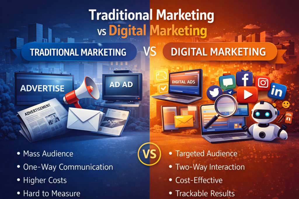 Marketing plays a vital role in business success, but the methods used to promote products and services have evolved significantly over time. Traditional marketing was once the primary way businesses reached customers, relying on offline channels such as newspapers, television, radio, and billboards. With the rapid growth of the internet and digital technologies, digital marketing has emerged as a powerful alternative. In 2026, understanding the key differences between traditional marketing and digital marketing is essential for businesses that want to remain competitive and grow sustainably.